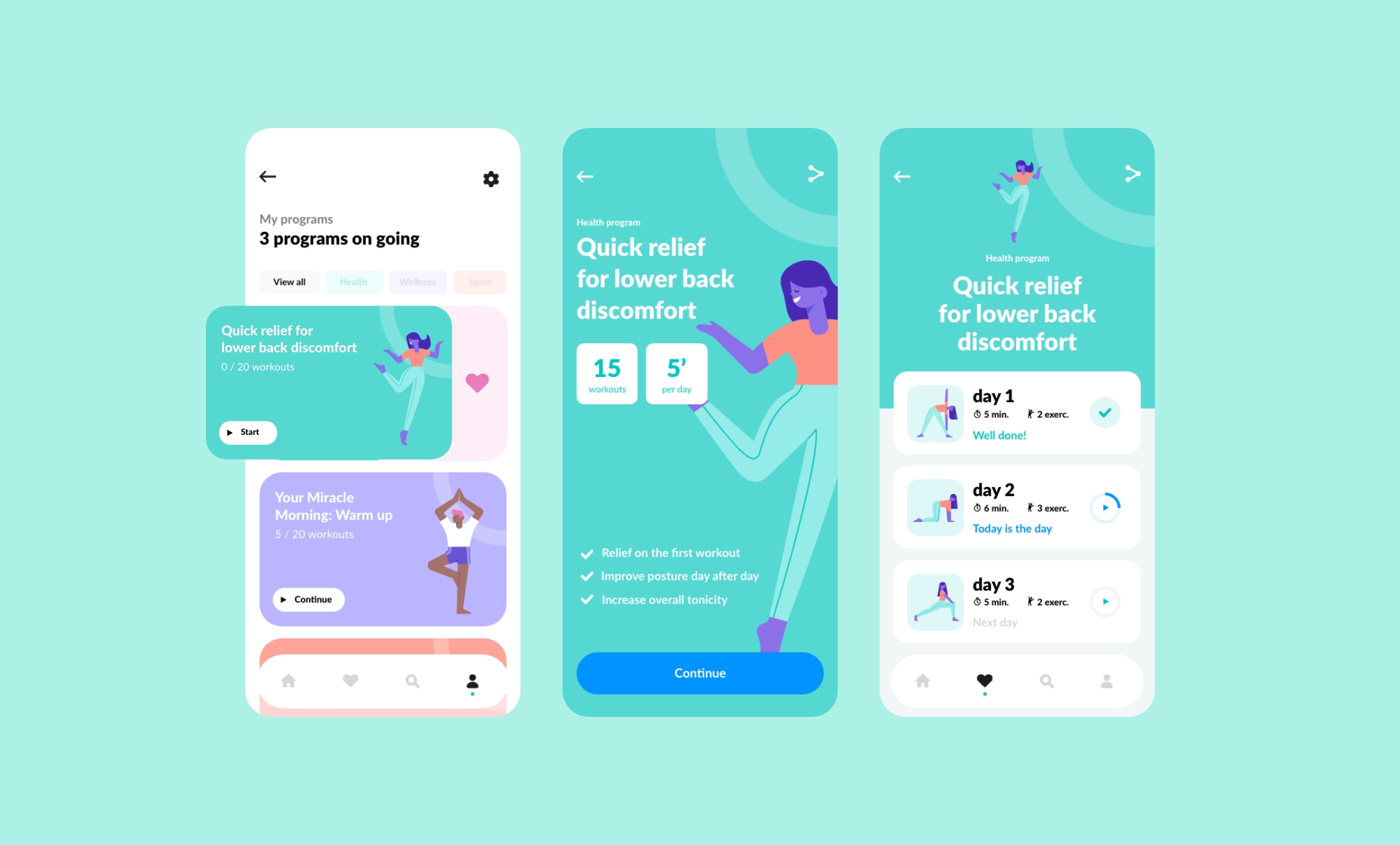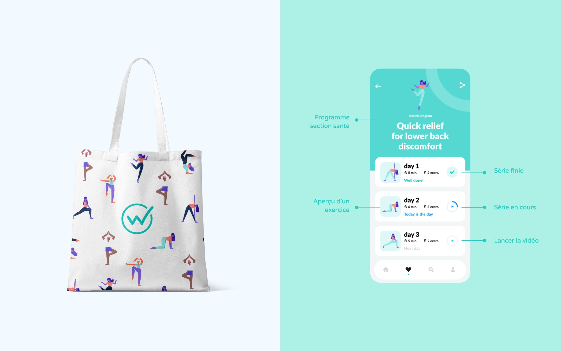 Il fallait construire un univers visuel qui soit à la fois fiable et sérieux car il s’agit de santé, mais aussi doux et feel good pour donner envie aux utilisateurs de venir faire leurs exercices chaque jour avec le sentiment de se faire du bien et d’oublier le monde parfois froid du medical.